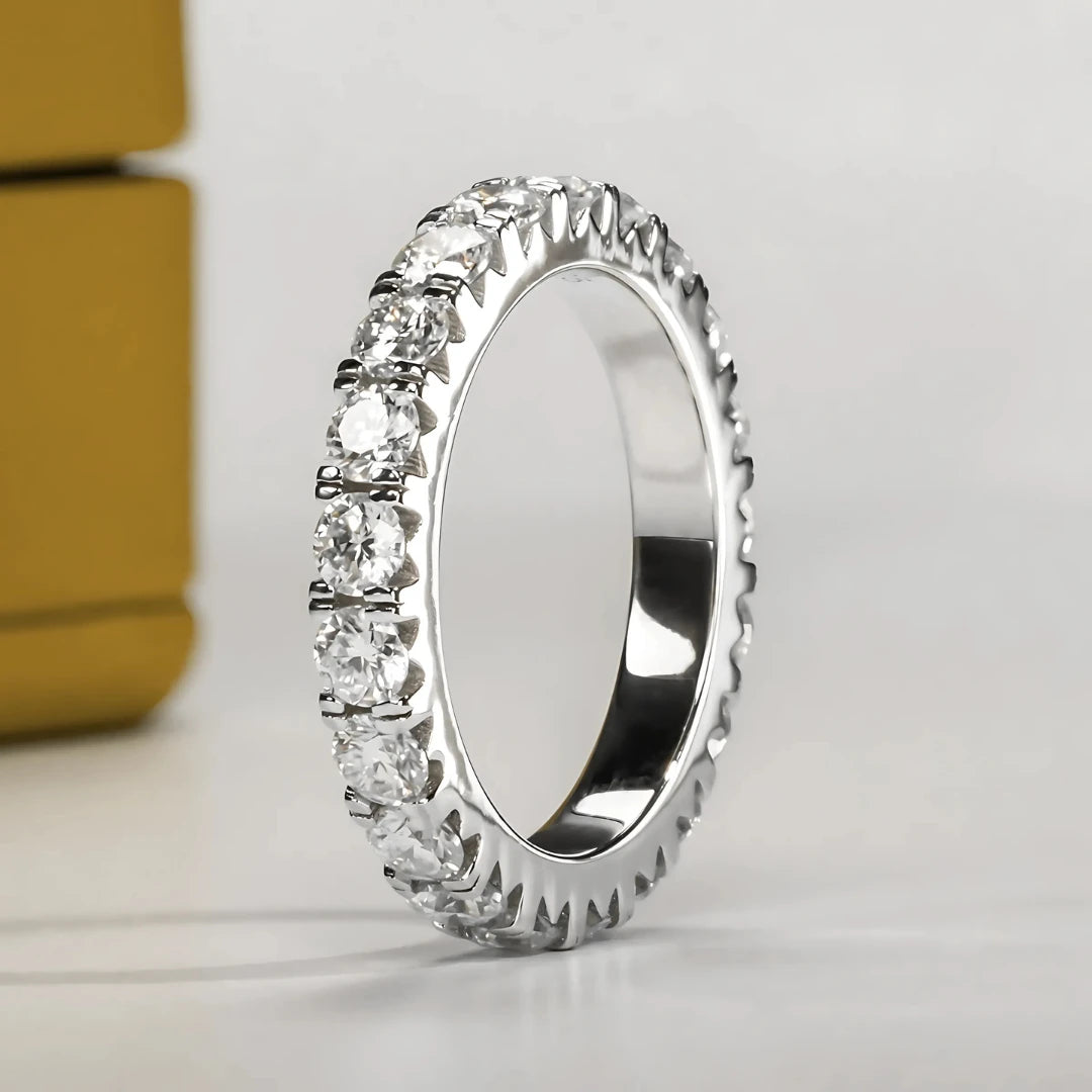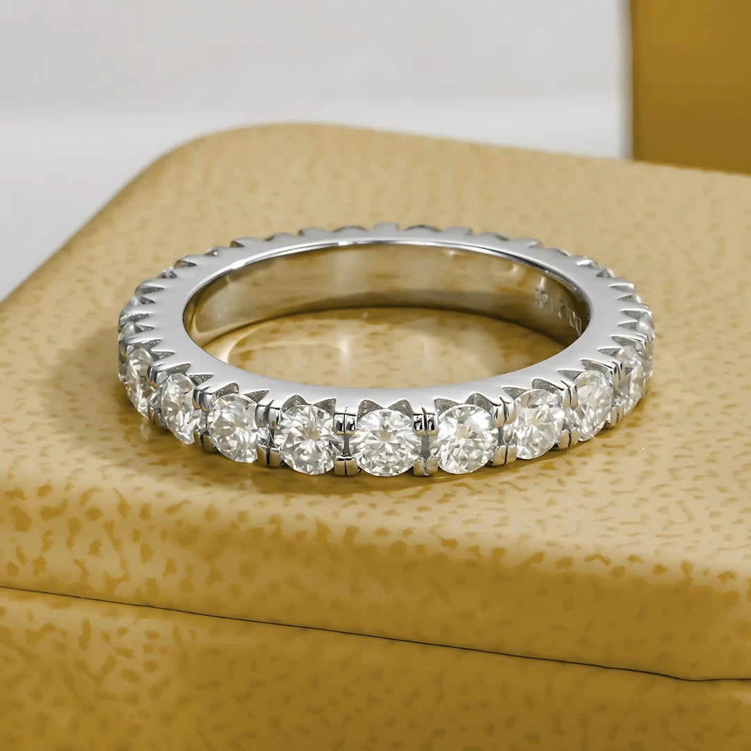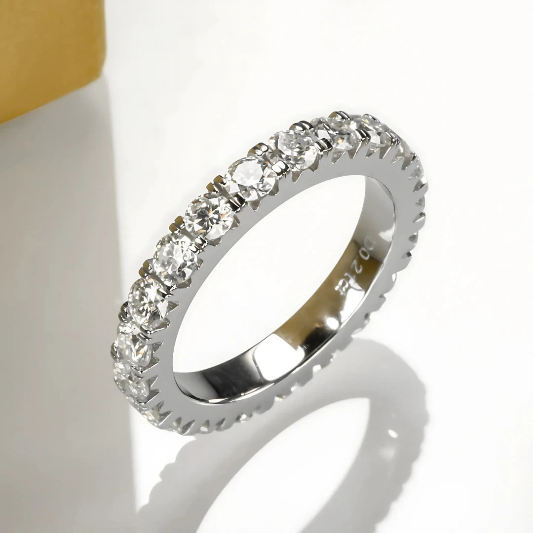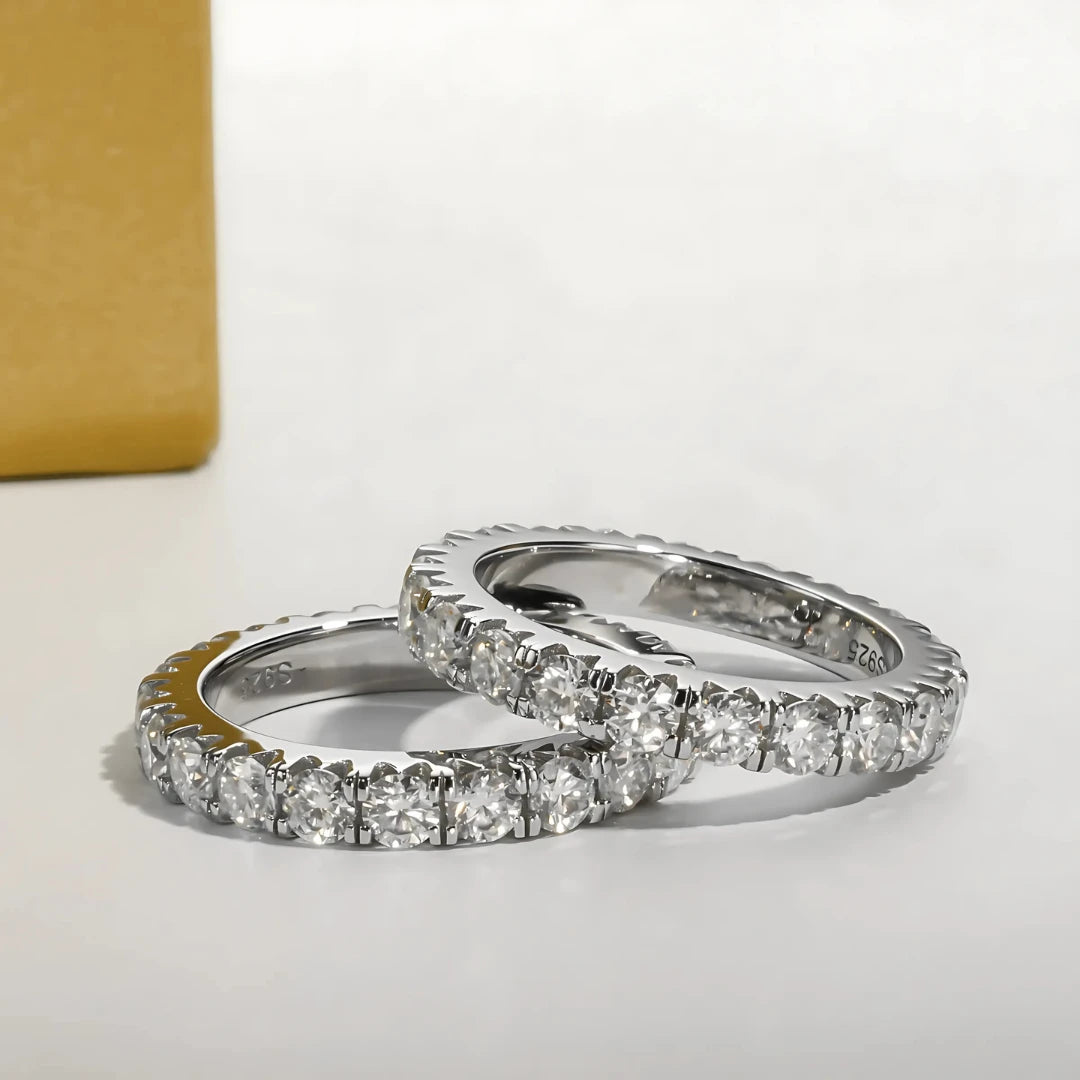 • Peso em Quilates: Moissanites de 0.1ct cada, totalizando entre 19 a 24 pedras, dependendo do tamanho da aliança.