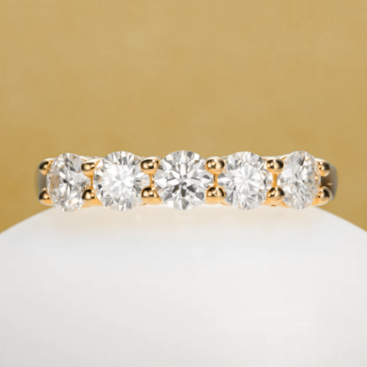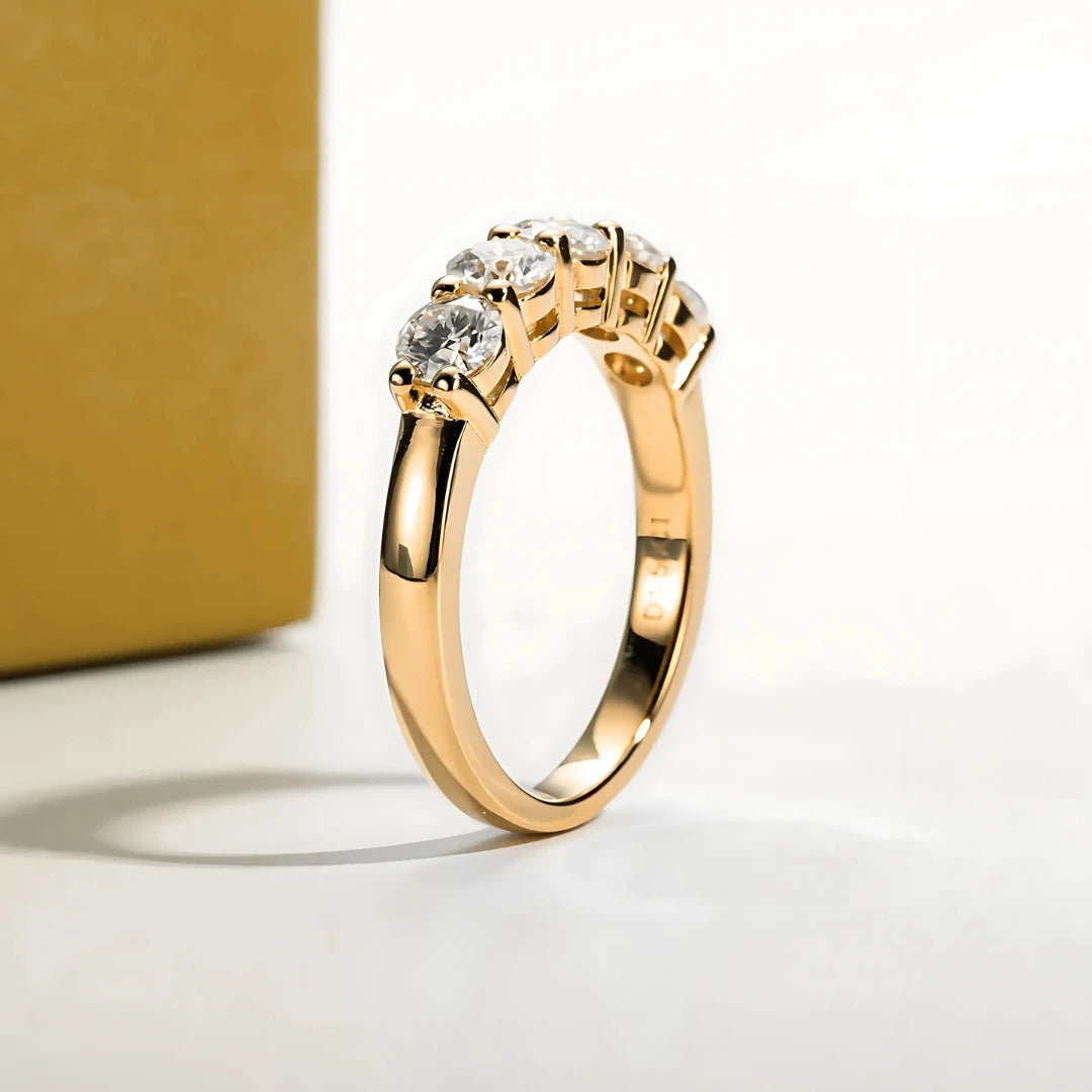 Um brilho suave e encantador, como os primeiros raios de sol ao amanhecer. A "Meia Aliança Crepúsculo Radiante" é a escolha perfeita para quem busca um design delicado e elegante, com suas cinco pedras redondas que capturam a luz de forma única. Seu acabamento impecável e a beleza atemporal fazem dela uma joia que será apreciada por gerações.