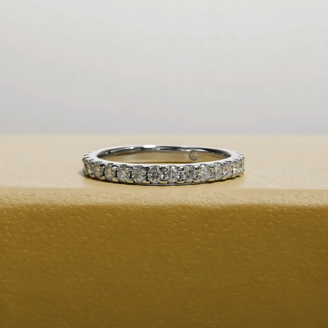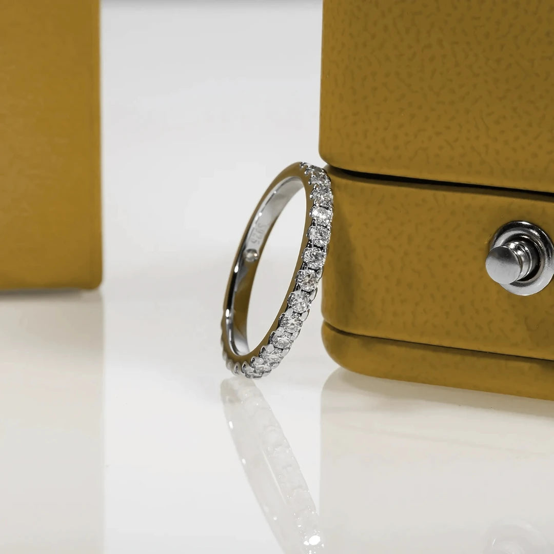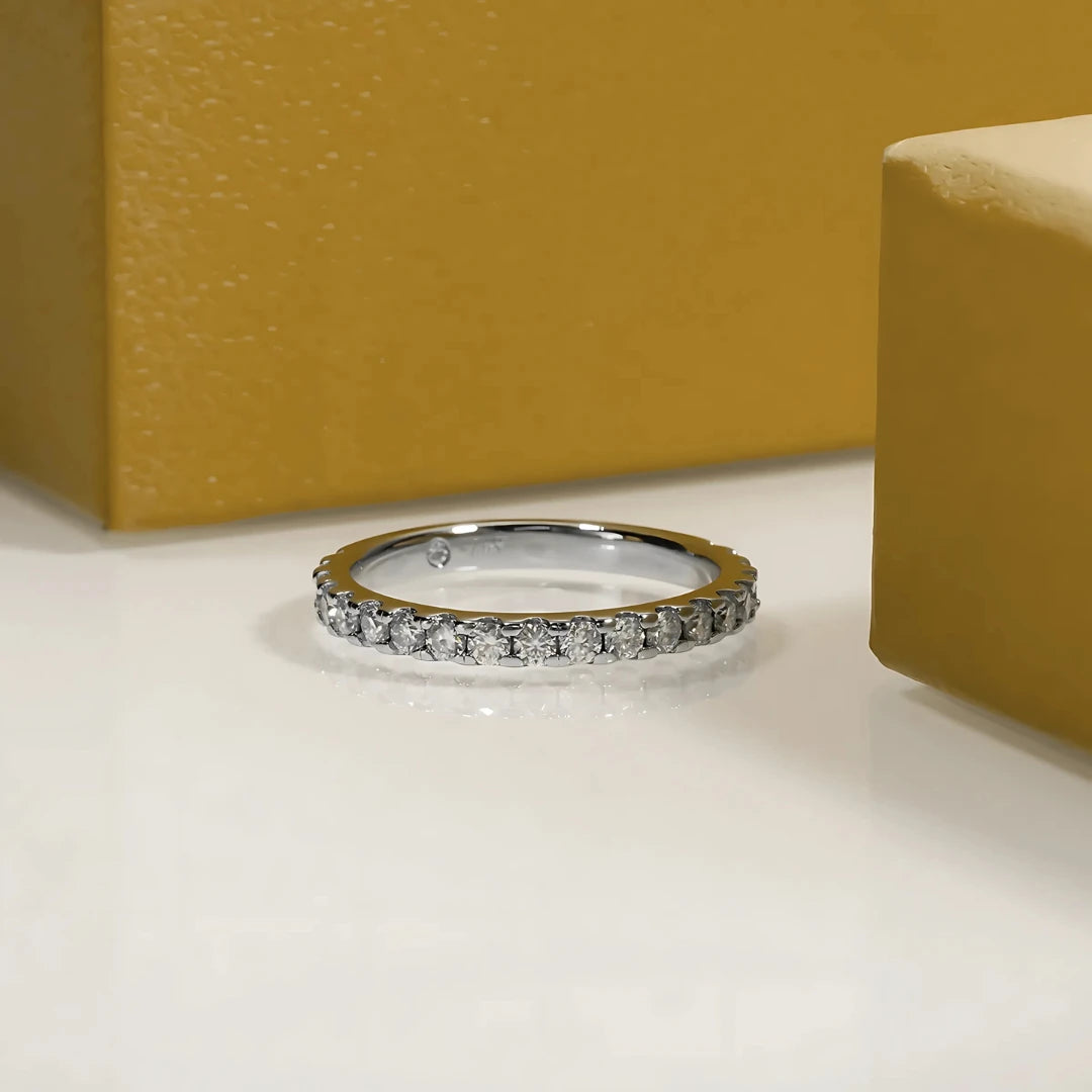 Elegância digna de uma realeza, a Meia Aliança Princesa Celeste foi criada para brilhar em momentos especiais e eternizar memórias. Com 20 moissanites cuidadosamente alinhados, esta joia combina o esplendor do ouro branco com o brilho celestial das pedras, oferecendo uma peça tão única quanto quem a usa.